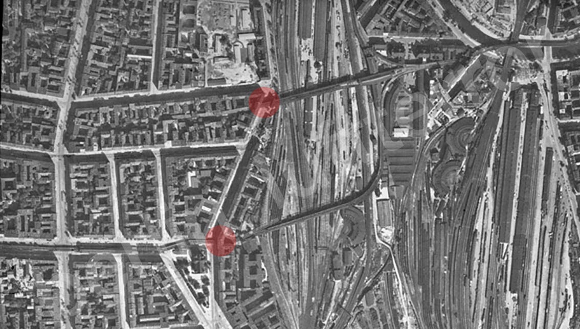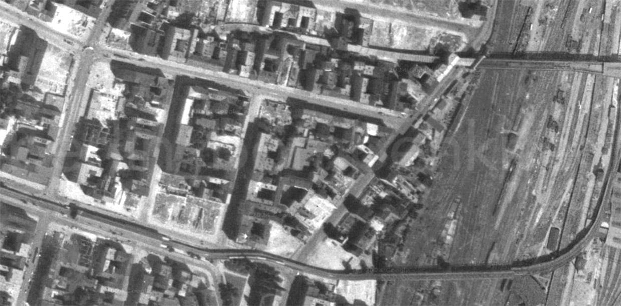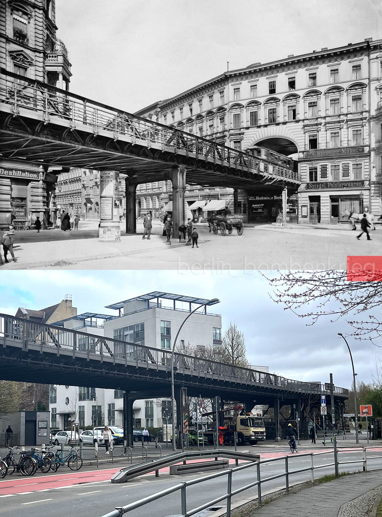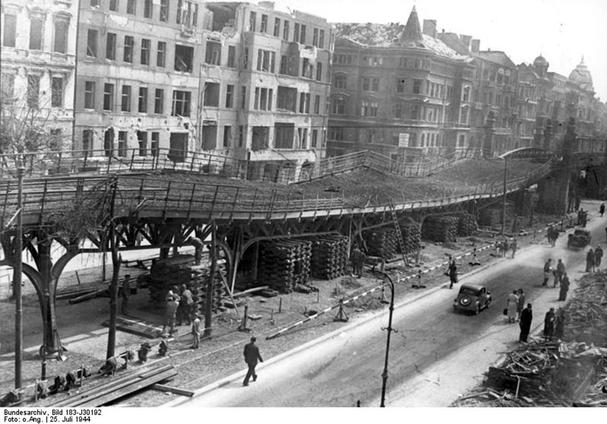 Further notable damage was received in early 1945 there, when on 24/25 February a British nuisance raid hit the elevated railway at Bülowstr. 97 with aerial mines (already hit on July 1944), and also in March 1945, when RAF Mosquitoes raided all area and left heavily damaged the adjacent streets and the Bülowstraße railway bridges.