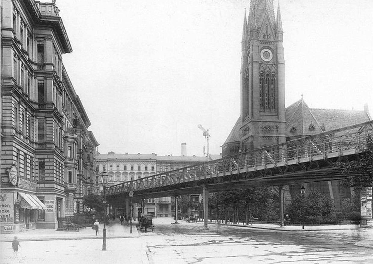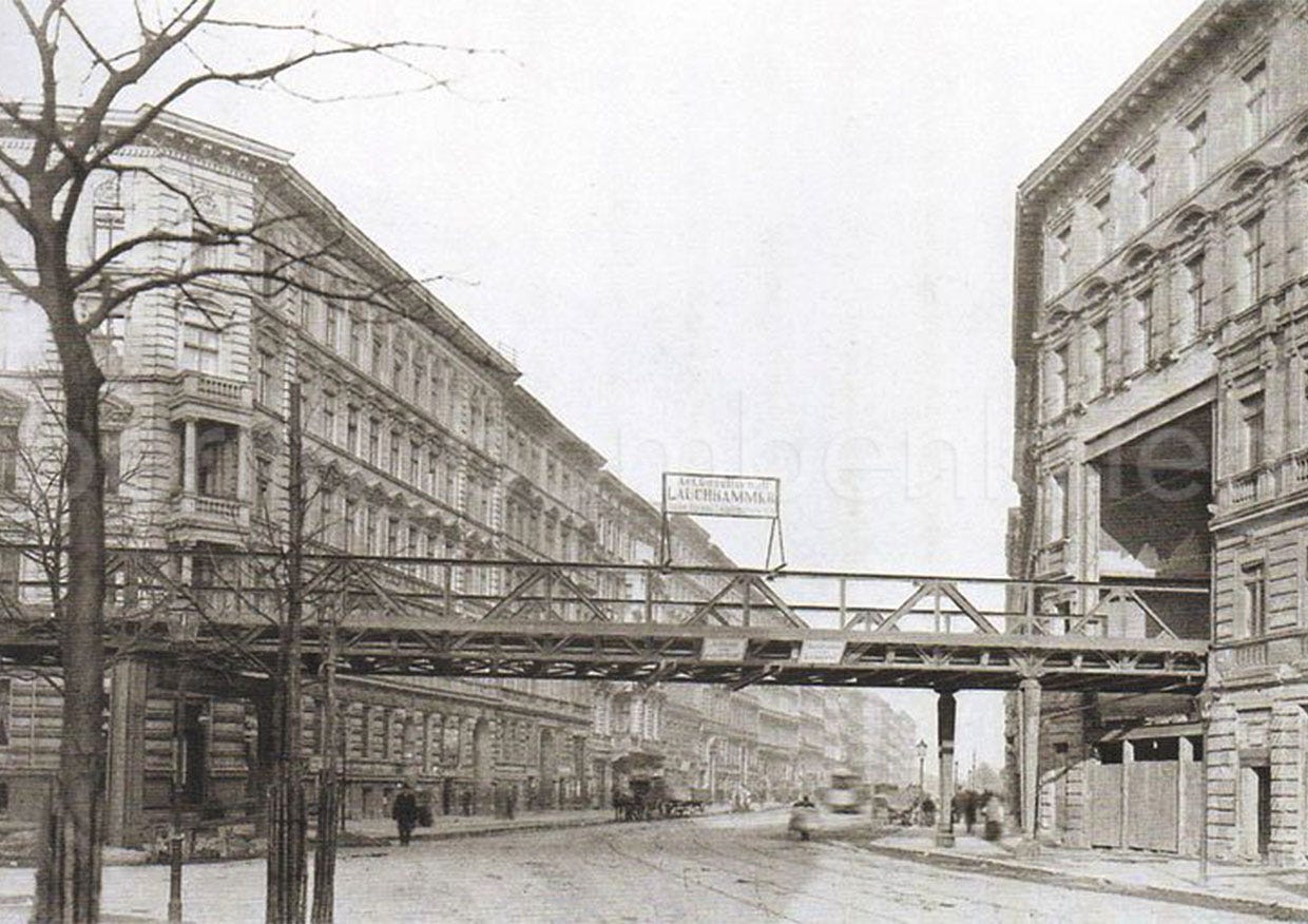 The Dennewitztraße tunnel was part of the ‘Berliner Hochbahn’ comprising parts of today’s lines U1 and U2 and ran west-east from Warschauer Brücke through Gleisdreieck and along Landwehrkanal towards Stralauer Tor. This was the first elevated and underground railway of the city of Berlin and it was inaugurated in February 1902. At first built by Hochbahngesellschaft under a Siemens and Halske design, it was a quite simple steel viaducts structure through main avenues with elaborately designed stations, but soon started to have a negative impact on the cityscape, and on the residents of the first floors too.