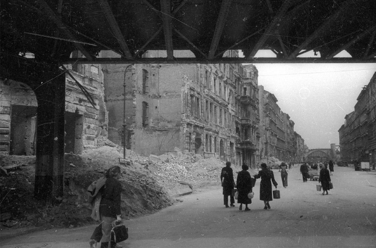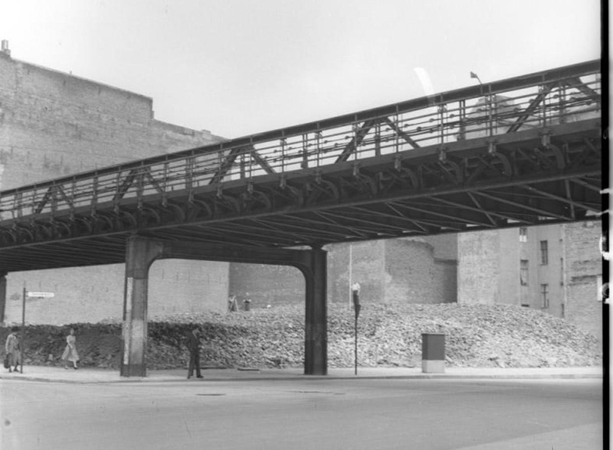 At the end of the war in May 1945, the capital appeared chaotic and ruined. The area in question, like the rest of the district, was in bad shape, with both tunnels and train lines heavily damaged by Allied bombs and the final street-battle with the Red Army. The Gleisdreieck train connection was reopened in November, hastily repaired, and the northern elevated line from late 1946 but without stopping at Nollendorfplatz, not the same happened to the southern tunnel route.