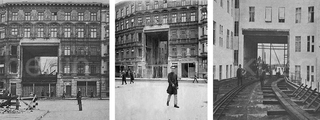 No other section would affect its residents as much as the ‘Tunnelhaus’. The elevated railway line ran from Bhf Bülowstr towards the Gleisdreieck (“triangle of tracks”) train junction but there was a “small” problem: a building at Dennewitzstr blocked the way. Two floors of the building had to be demolished to build the tunnel pass, so the railway company (BVG) had no choice but to buy the building and so was born the so called ‘Durchbrochenes Haus’ which soon became one of the unusual sights and attractions of the city and achieved international fame, being visited by locals and tourist alike.