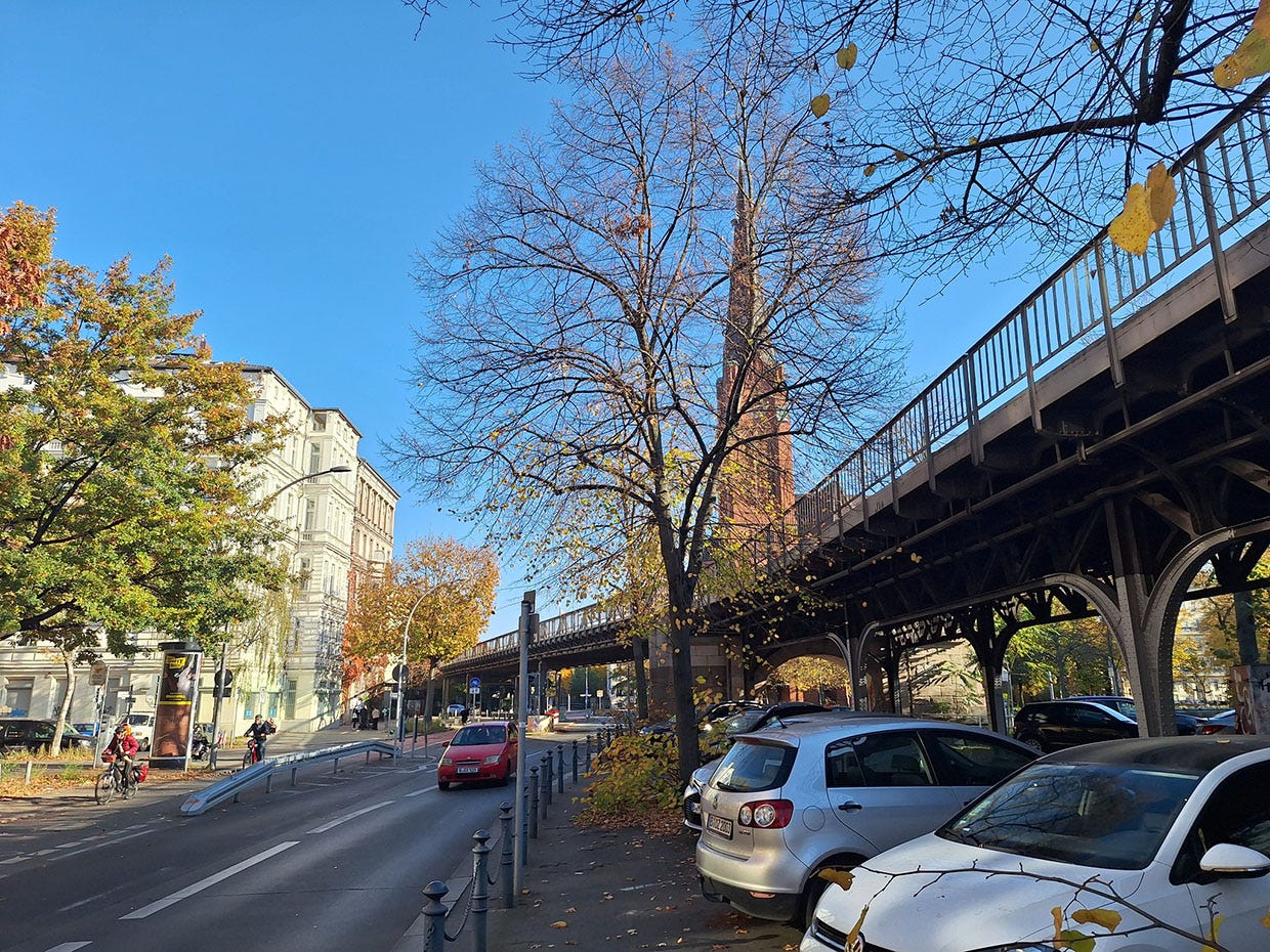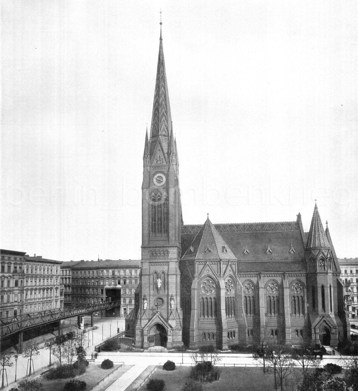 A few metres next to the elevated U-Bahn tunnel pass, Dennewitzstraße goes into a more open space known as Dennewitzplatz. There stands the Lutherkirche, a brick building built from 1891 to 1894 and designed by Johannes Otzen in Gothic style (“modern Gothic”) and intended to accommodate the further increase in population and Luther believers in the area. To go around the church, the viaduct was forced to make a small curve continuing its way towards Bülowstr, known as the ‘Pastorenkurve.’ Today, the church is home of the English-spoken Amerikanische Kirche in Berlin, an ecumenical congregation originally based at Nollendorfplatz, which moved here in November 2002. Hence the popular name of this church as ‘the American Church.’