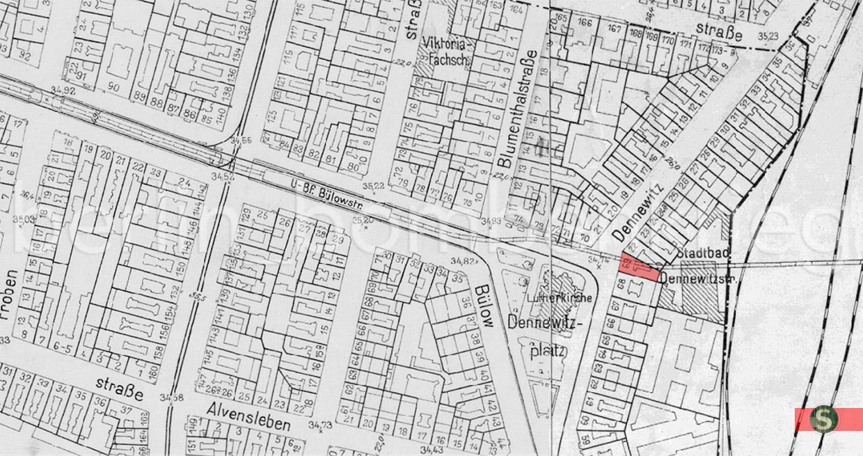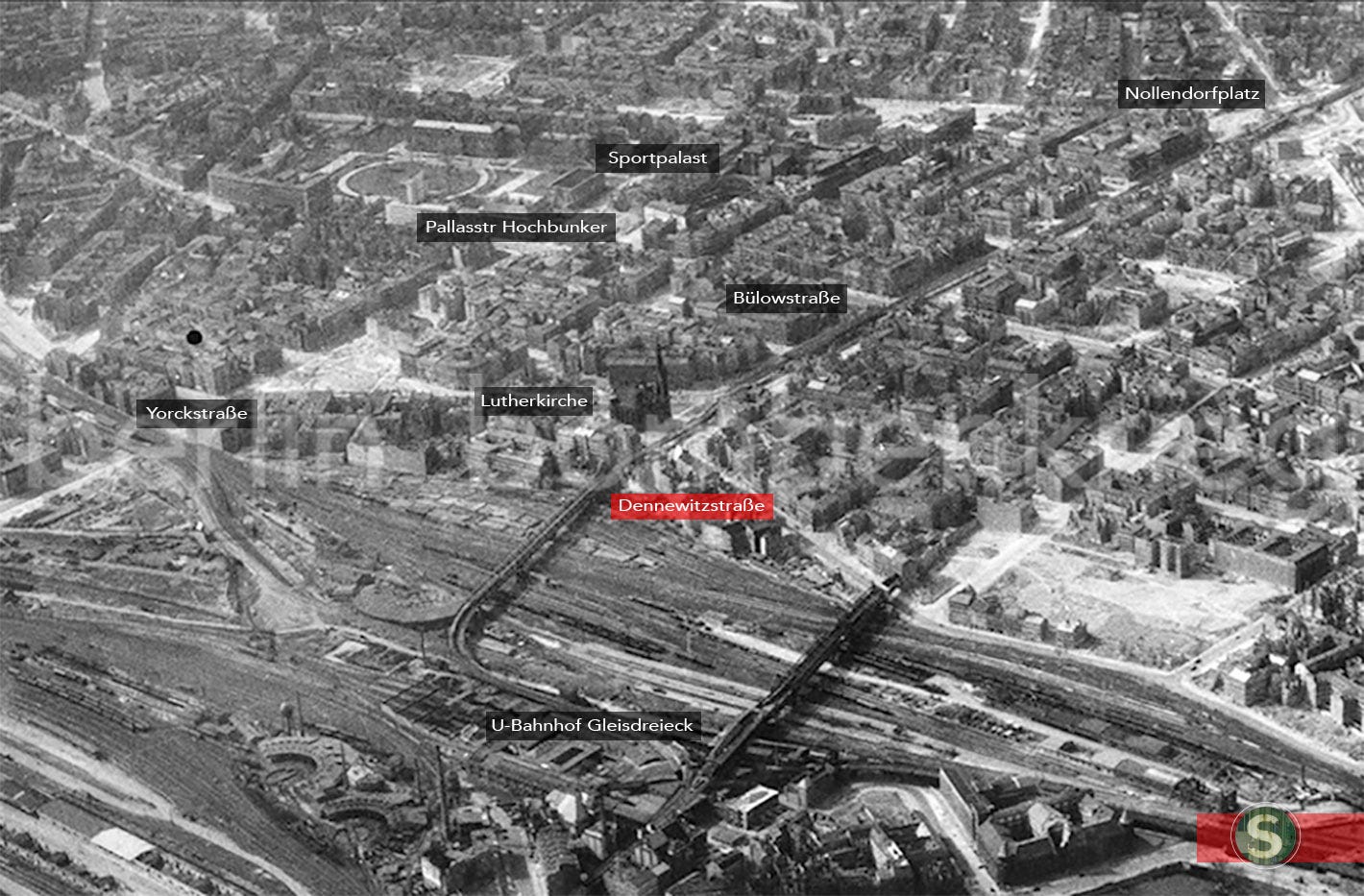 Both Dennewitzstraße and Bülowstr were located in one of the western districts most heavily affected by bombs but, sadly, we have been unable to find any picture of the exact location during the war years or the immediate 1930s. Just a few blocks away of this area were located two notable Berlin ‘Bomberkrieg’ landmarks: the famous Sportpalast (destroyed in January 1944) and the huge air-raid shelter at Pallasstraße, which survived the war and can be found there today.