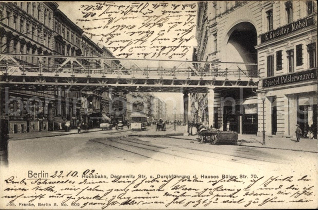 The location became so popular that it appeared in a 1927 cinema movie too, with several shots of trains passing through the building pass: “Berlin. Die Sinfonie der Großstadt”, directed by Walther Ruttmann (1887-1941). Ruttmann’s Berlin experimental silent film transports its audience to the Berlin of the 1920s, the metropolis and its daily life, the machines and the urban architecture. You can watch the film here (Dennewitzstr can be seen from minute 37 of the footage).