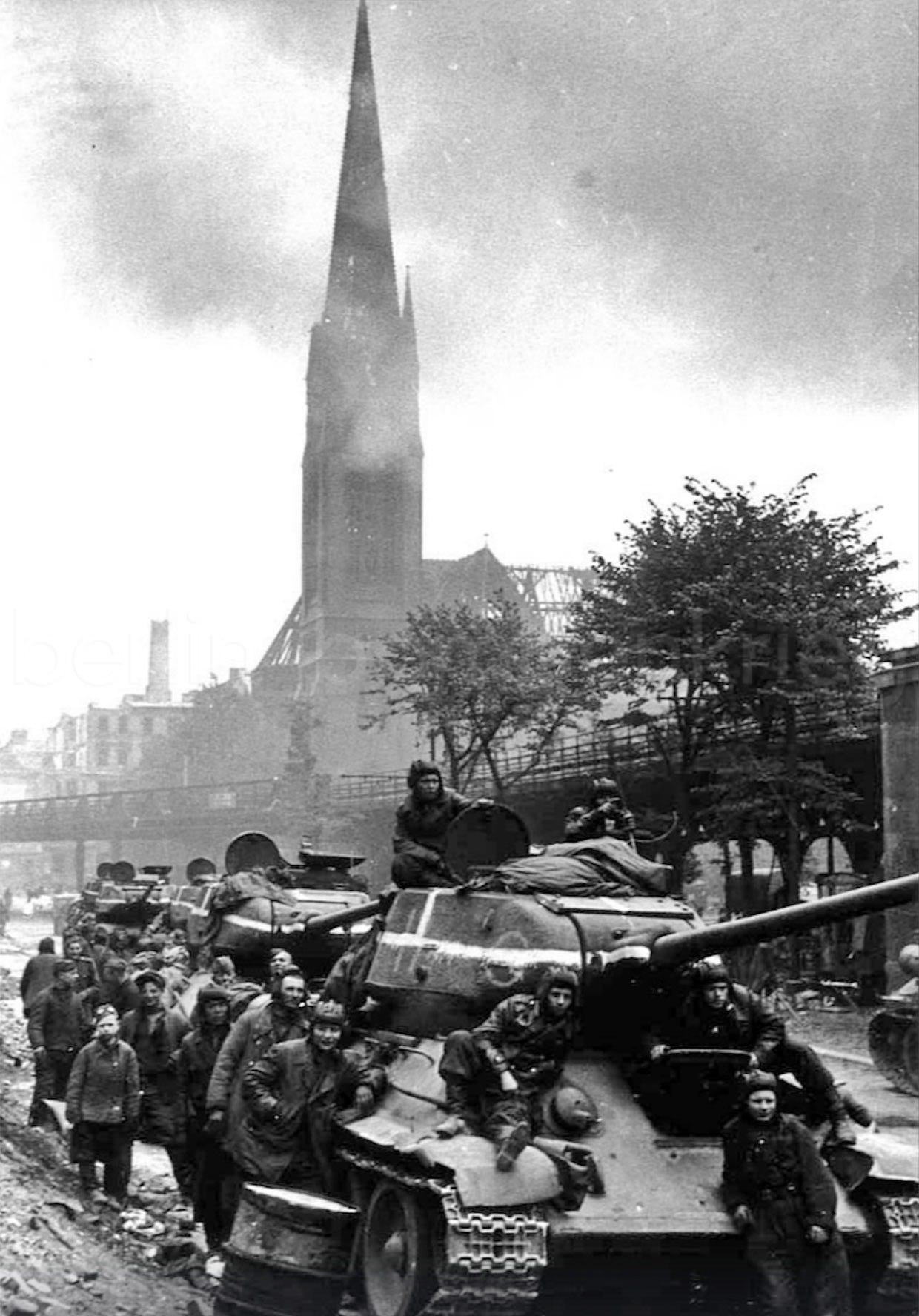 During the last week of April 1945, further damage was done to adjacent buildings at this area, especially along the Bülowstraße elevated railway axis of advance. Soviet forces reached this area on April 29th, following the German withdrawal from the Landwehr Canal at Potsdamer Str, with the powerful 3rd Guards Tank Army led by Rybalko attacking from the eastern part of the urban area of Schöneberg in the direction of Wilmersdorf and Charlottenburg. The area was defended by elements from the Panzer-Division ‘Müncheberg’ and several groups of Volkssturm battalions, which remained at Nollendorfplatz at several strong points. Units of the 9th Mechanized Corps attacked into Schöneberg district from the east (Yorckstraße) and from the south (Hauptstr.) The 70th Mechanized Brigade led an offensive advancing from today’s Gleisdreieck parks starting 9:00 hrs in the morning with heavy artillery support along the Bülowstr route, meanwhile the 91 Tank Brigade advanced in a parallel southern route. The armoured elements get the Pallasstraße-Goltzstr intersection by early morning hours and finally reached the Wittenbergplatz line in the early evening of that day after fierce battle with small defensive points, overcoming enemy resistance by the end of the day. German resistance ceased on May 2nd finally.