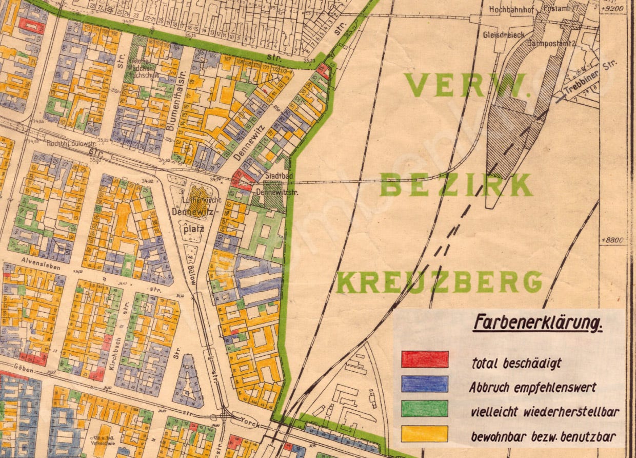 This image is part of a series of scale maps commissioned by the Bezirksamt Tempelhof-Schöneberg as well as the Hauptamtes für Vermessung der Stadt Berlin detailing every building and its degree of destruction that were destroyed, damaged, and capable of reconstruction at the district after World War 2. The condition of the buildings was divided into four categories and colour-coded on the damage maps. Note that our tunnel-building located at Dennewitzstraße 69 and the adjacent house (Nr 22) are marked in red as ‘Total beschädigt’ (Totally damaged) meanwhile surrounding ones were in better condition (blue and green).