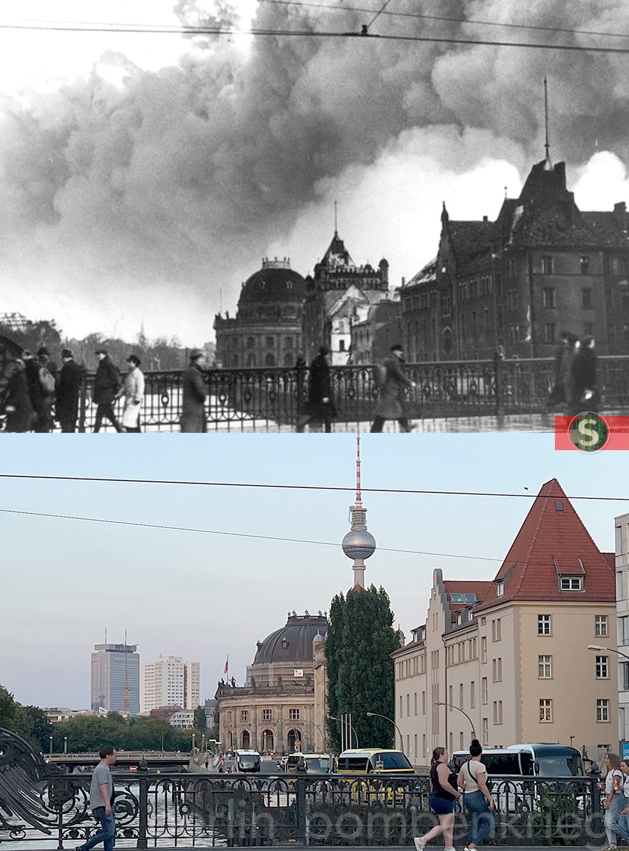 February 3, 1945: air raid in Berlin-Mitte viewed from the same spot in 2024. Photos: bpk/by the author