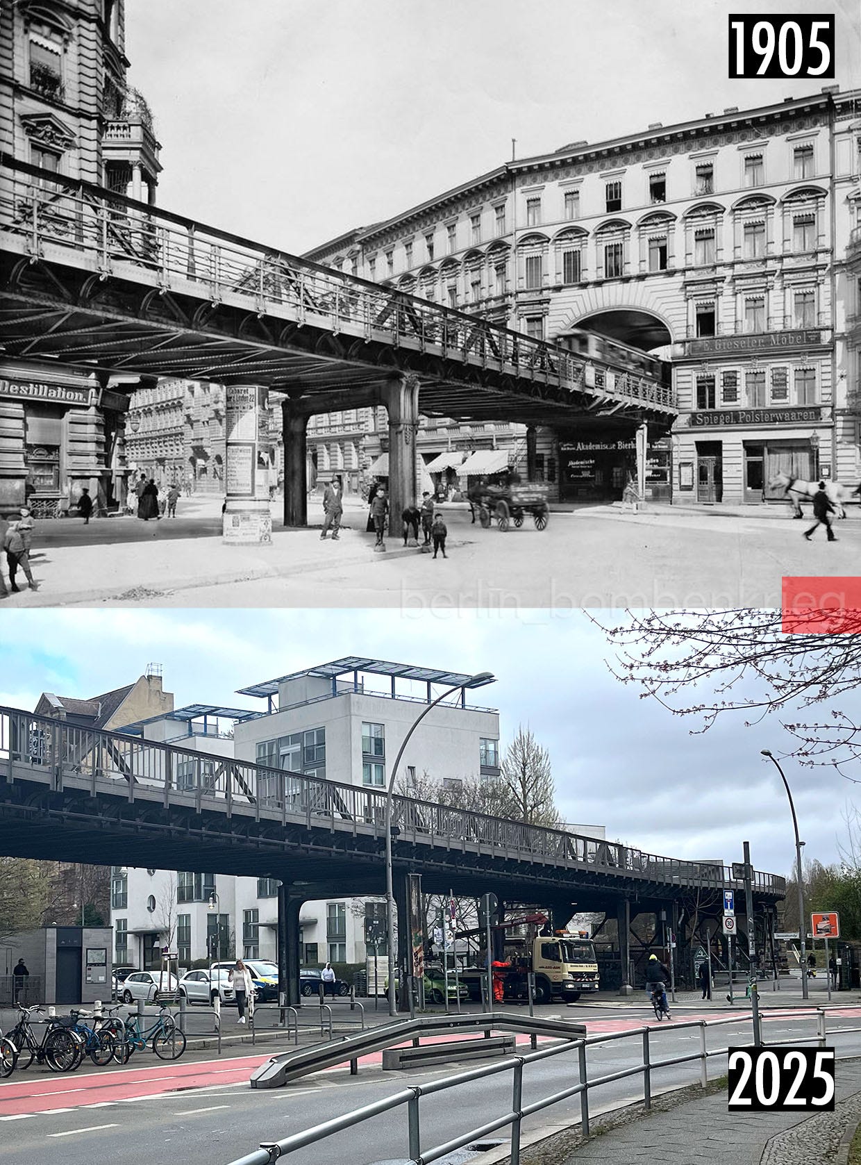 This 1905 image shows the pre-war tunnel of the elevated railway line of Berlin’s U-Bahn located between Dennewitzstraße and Bülowstr. This line was the first one of the city and was built by Siemens and Halske in 1902, comprising parts of today’s lines U1 and U2 and rans west-east from Warschauer Brücke through Gleisdreieck and along Landwehrkanal towards Stralauer Tor. This elevated railway was destroyed during the British bombing campaign of November 1943. [Photo: Max Missmann-Stadtmuseum Berlin]. Below is a March 2025 photo from the same viewpoint. The elevated railway was reconstructed after the war, not the same to the buildings between Dennewitzstraße and Bülowstr, destroyed during the intense bombings by RAF aircraft. [Photo by the author.]