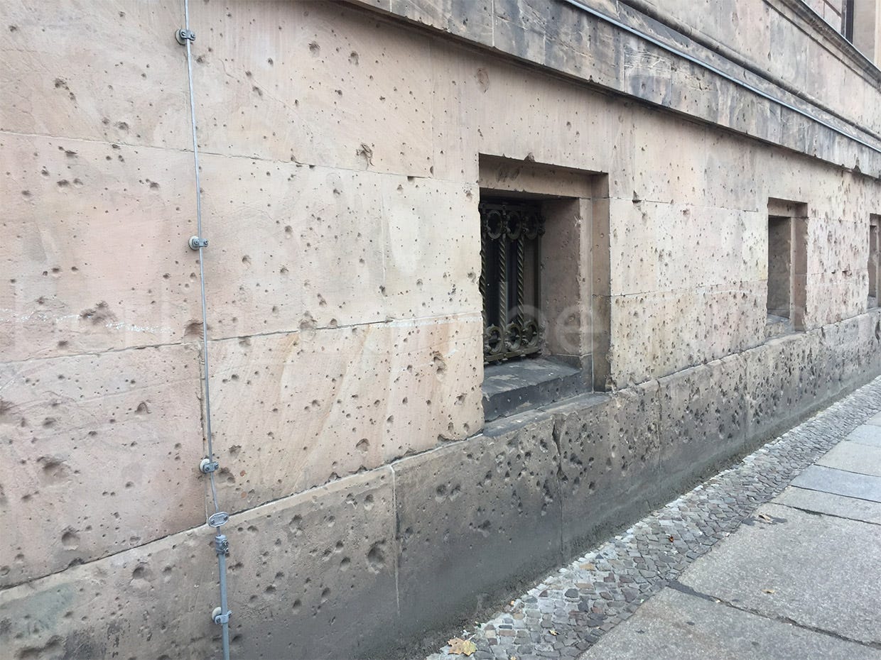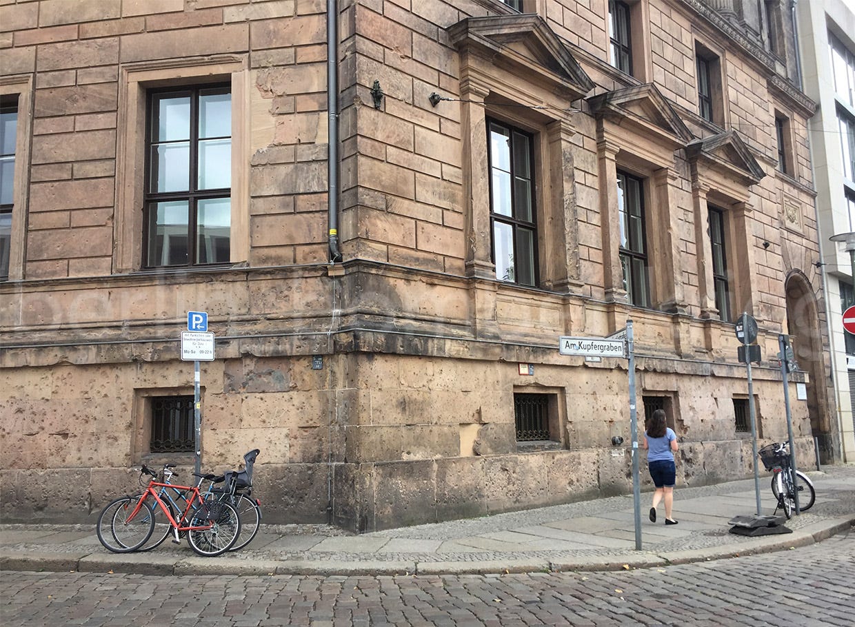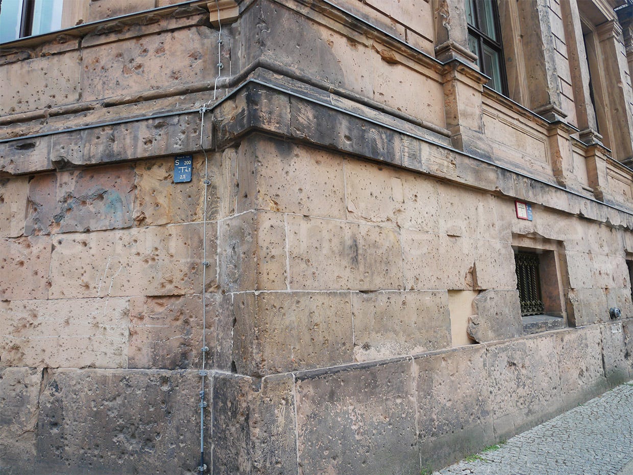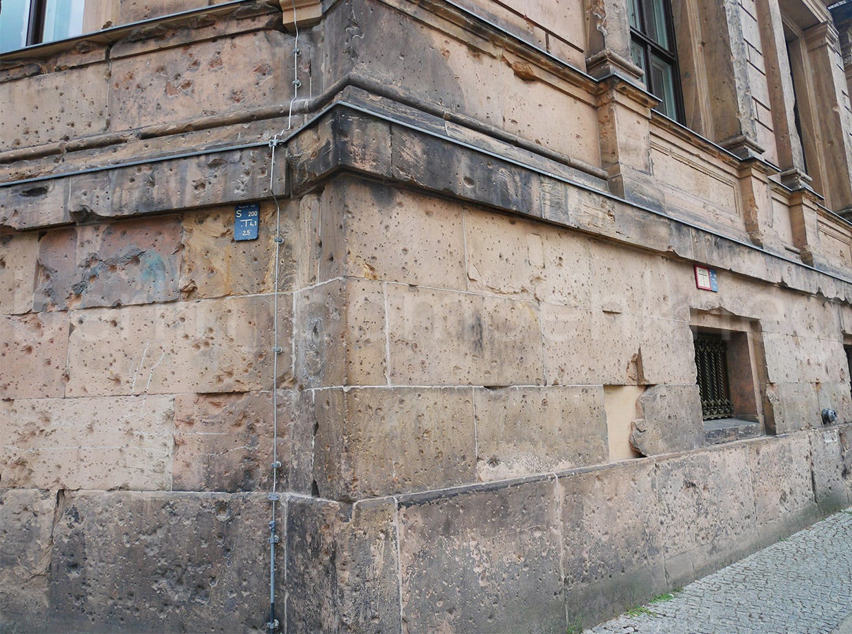 This building was built in 1879-83 with a four-storey sandstone facade in Italian Renaissance forms mixed with simple Prussian functional design. It was renovated in 2002 to be the Faculty of Economic Sciences and from 2009 started the restoration of the roof and facade in cooperation with the Landesamt für Denkmalpflege (the State Office for preservation of historic monuments), with emphasis in that the signs of war remain legible on its 1.200 m2 facade. The work was made by Ellwart Steinrestaurieung, an experienced company focused on monument and ancient buildings restoration, in close cooperation with the architecture office Martin Focks. In their study they asked themselves before the restoration began: “…Can a façade repair appropriate to the monument be realized without neglecting the age value of the building and without distorting or even eliminating the historical traces of war damage?”