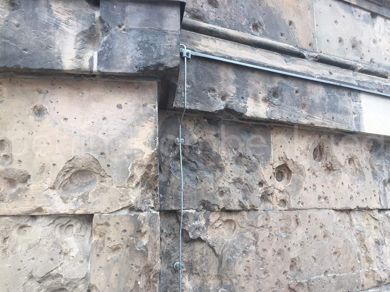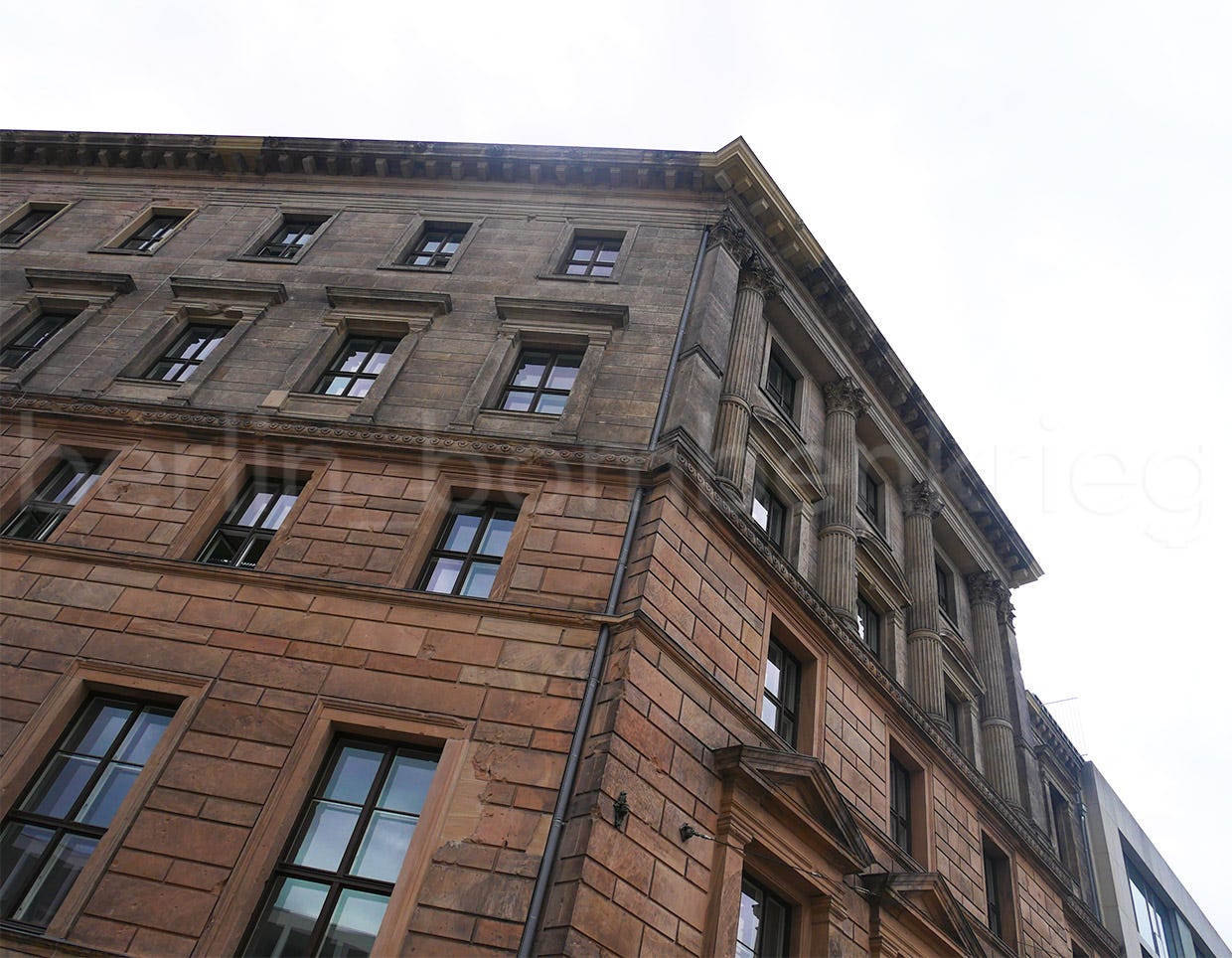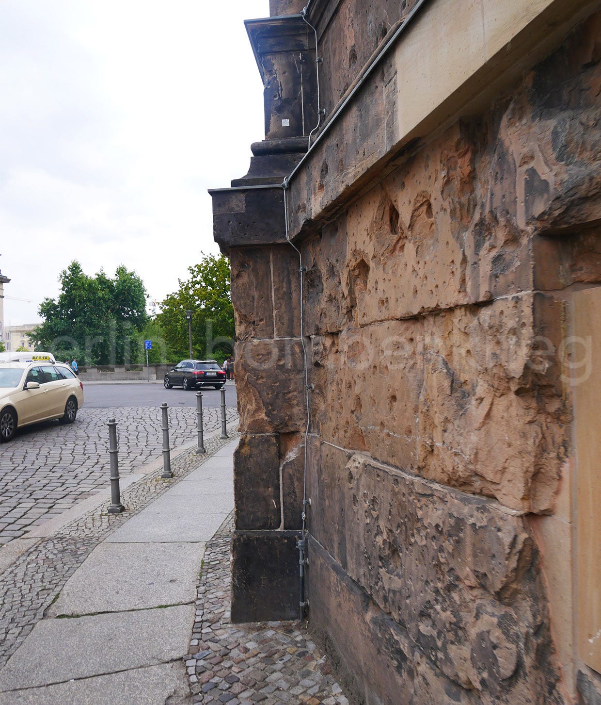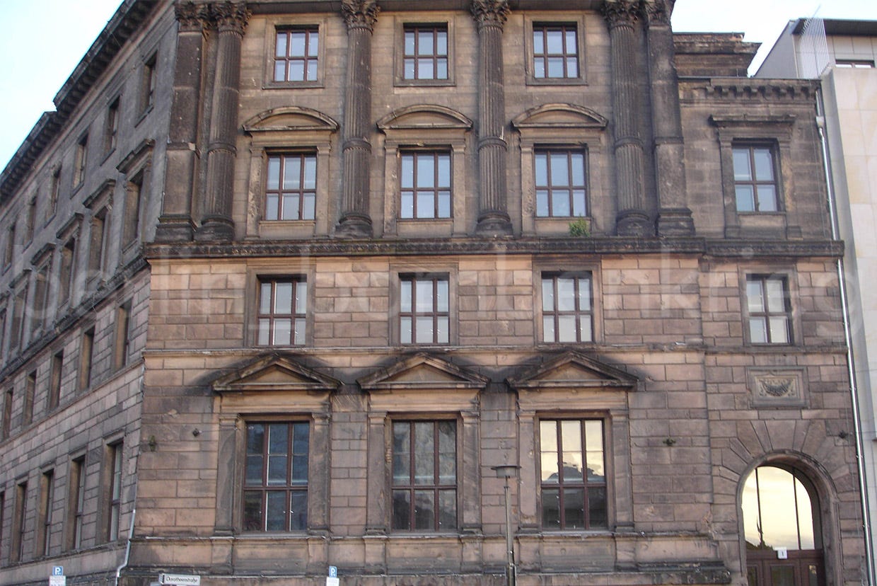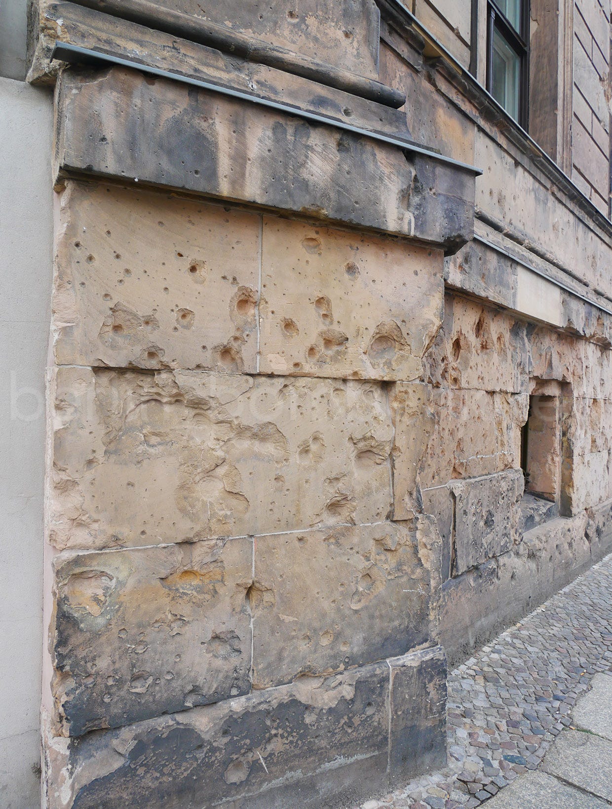 This building was built in 1879-83 with a four-storey sandstone facade in Italian Renaissance forms mixed with simple Prussian functional design. It was renovated in 2002 to be the Faculty of Economic Sciences and from 2009 started the restoration of the roof and facade in cooperation with the Landesamt für Denkmalpflege (the State Office for preservation of historic monuments), with emphasis in that the signs of war remain legible on its 1.200 m2 facade. The work was made by Ellwart Steinrestaurieung, an experienced company focused on monument and ancient buildings restoration, in close cooperation with the architecture office Martin Focks. In their study they asked themselves before the restoration began: “…Can a façade repair appropriate to the monument be realized without neglecting the age value of the building and without distorting or even eliminating the historical traces of war damage?”