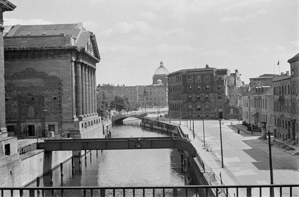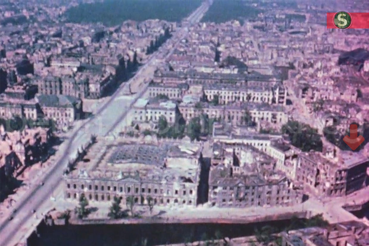 This aerial view taken a few days after the war’s end in Berlin, clearly shows the devastation suffered by Mitte district. Museumsinsel with Altes Museum is in the foreground, Unter den Linden crossing from top to bottom, and other main sites like the Zeughaus, Staatsoper, Humboldt Universität, and the green Tiergarten park far behind. Our “time-capsule” building is seen at extreme right, marked with a red arrow.