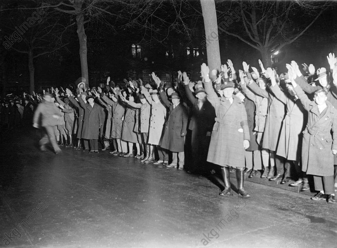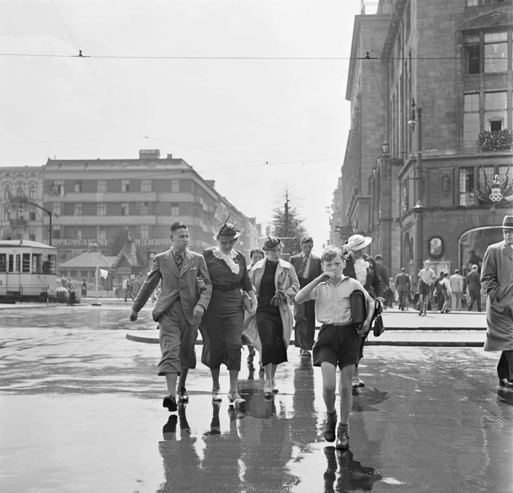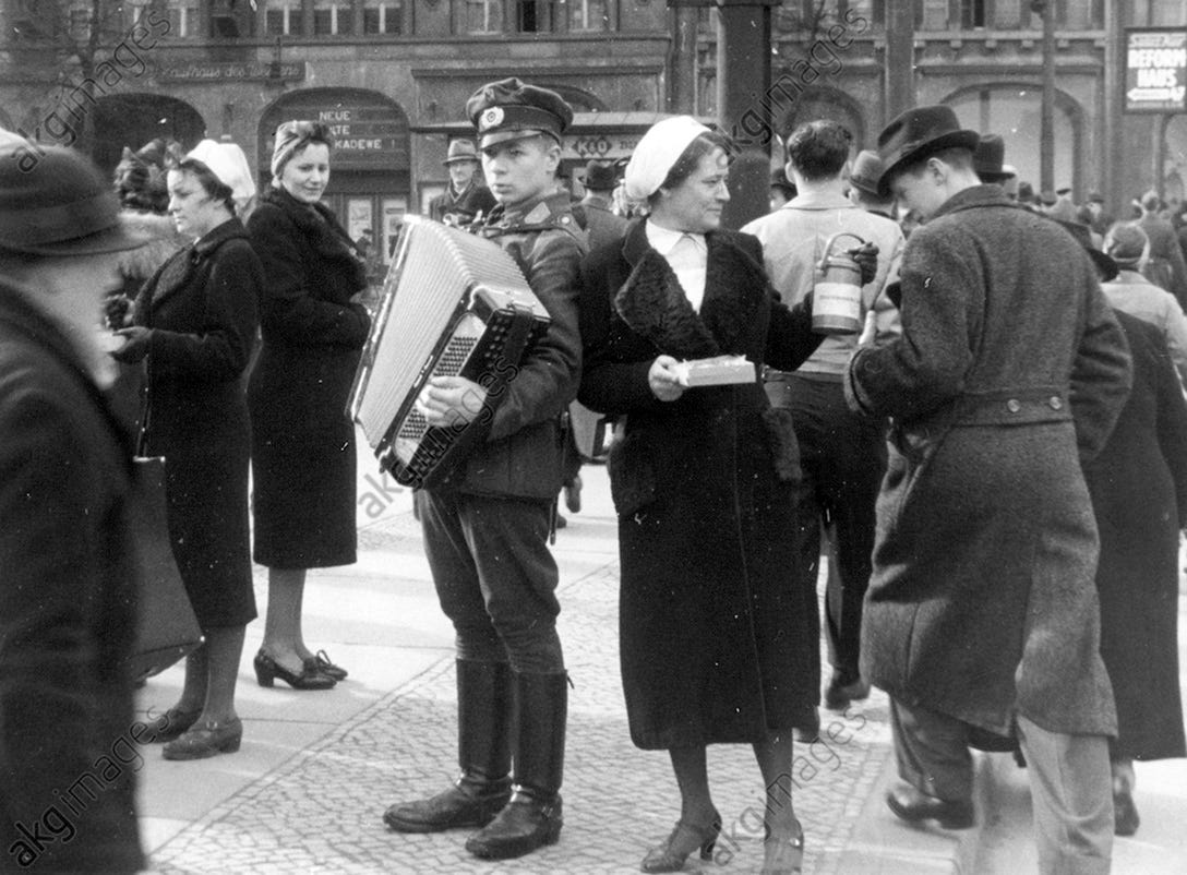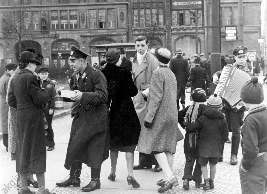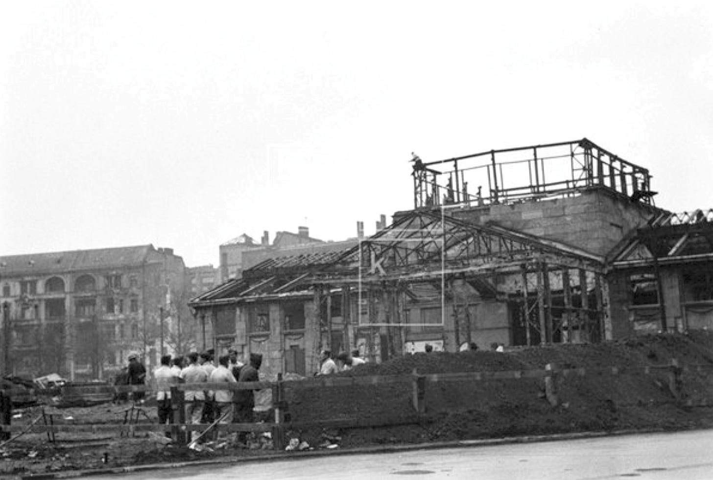 RAF’s Mosquitoes nuisance raids were made with the aim of keeping the enemy on alert for long periods of the night. In this series taken in 1945 at Wittenbergplatz, we can see the clean-up work after an air raid, some direct bomb direct hit has already destroyed the main entrance to the underground station.