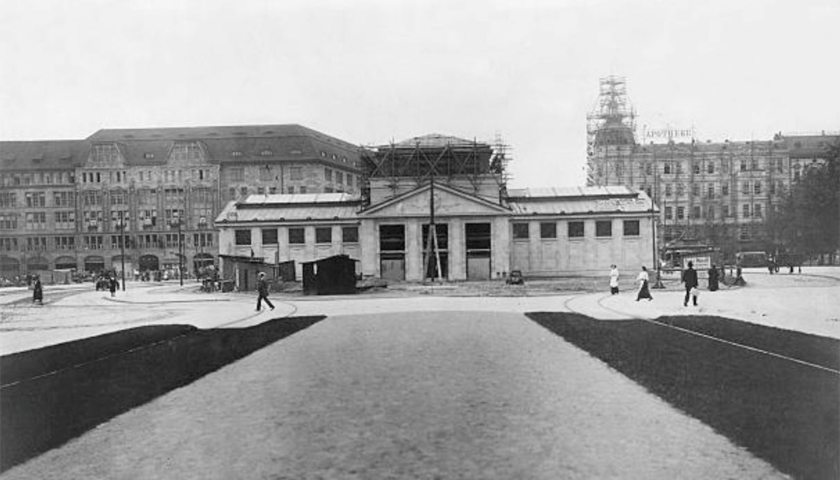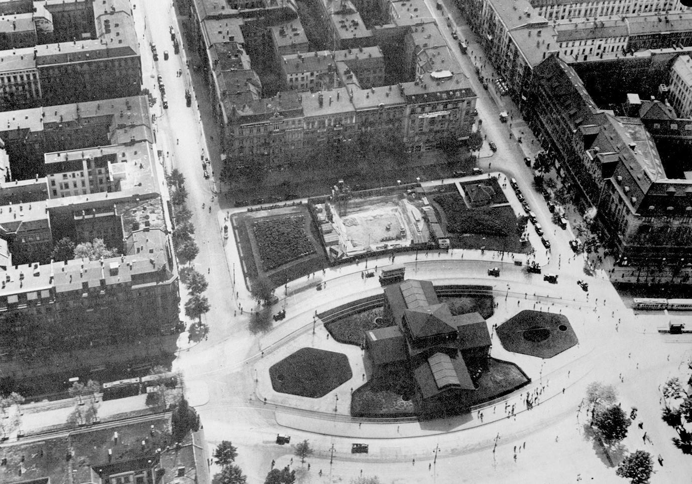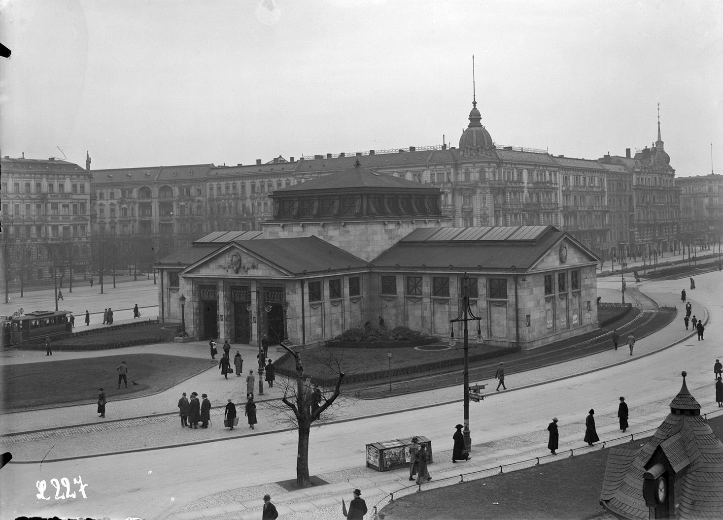 In 1912, a major redesign of the square was made, with a cross-shaped entrance building to access the U-Bhf underground station in the centre of the plaza, designed by Alfred Grenander (1863-1931) with neoclassical elements. The hall, built by Konstruktionsbüro Siemens & Halske AG, exits the underground train platforms to Tauentzienstraße and Kleiststraße both and became its most distinctive element, dominating Wittenbergplatz. A conical lantern would be added atop of the roof in the 1930s.