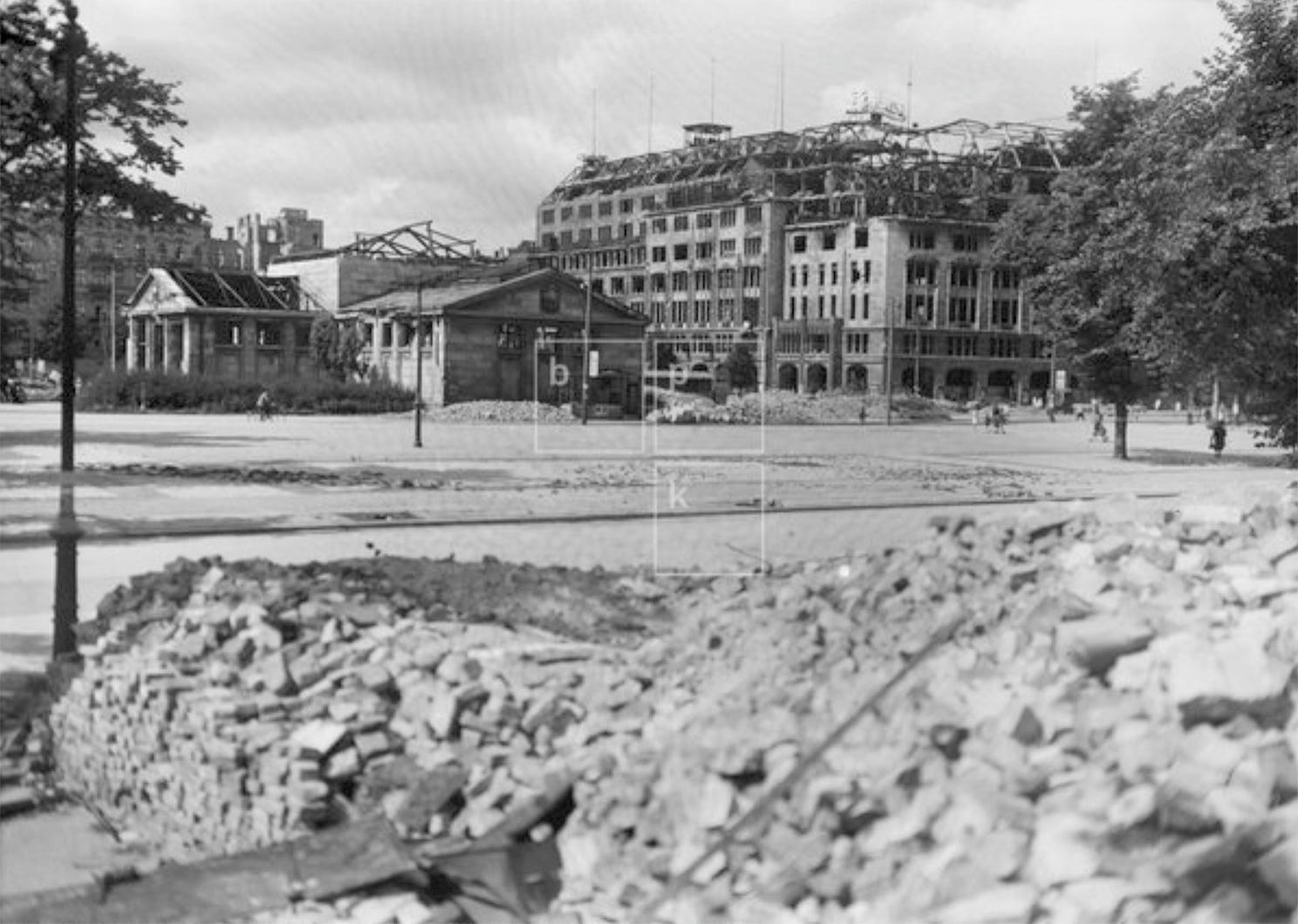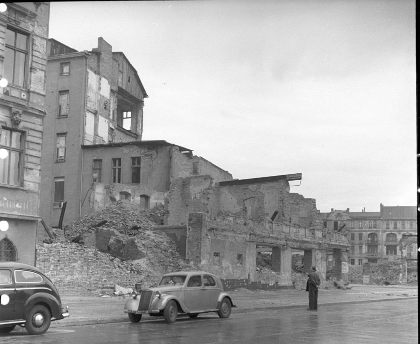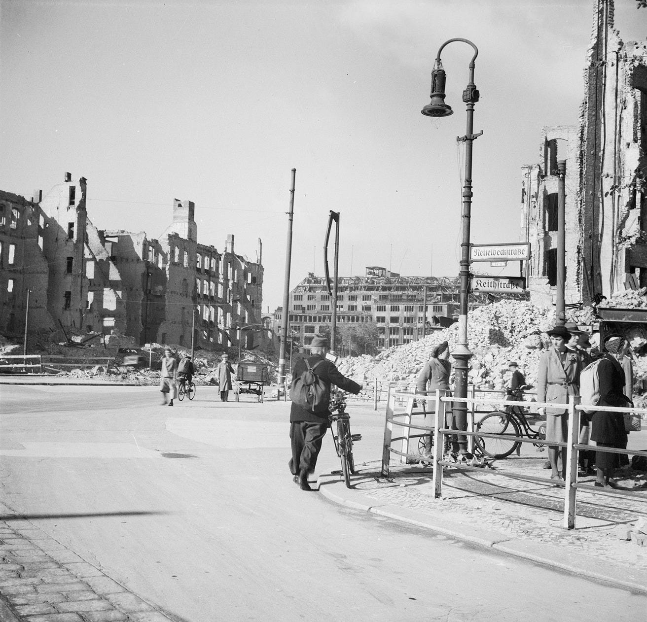 Three years after the end of the war Wittenbergplatz area was still full of debris and scars from the fighting, with the titanic KaDeWe building left in ruins in the background, 1948.Photo: bpk/Kunstbibliothek, SMB, Photothek Willy Römer