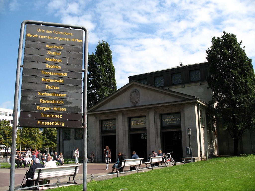Today, Wittenbergplatz has become more than a underground station: it is a memorial place to remember the Holocaust and to not forget the dark years ruled by the Nazis and its horrors: a memorial plaque signpost with the names of several concentration camps with the text “Places of Terror We Must Never Forget” was erected in 1967 in front of the main hall (eastern gate) and in recent years a capital “B” sculpture in the name of the International Auschwitz Committee was placed here too.
