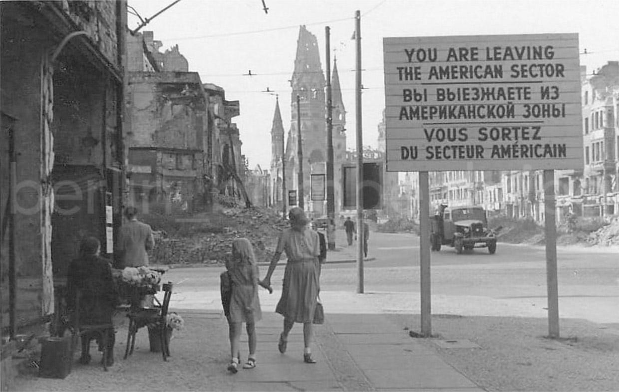 Life goes on among ruins: a striking scene at the British-US border with the destroyed Kaiser-Wilhelm church and the now famous ‘You are leaving the American sector’ sign in the foreground, Tauentzienstraße, 1946.Photo: Everett Collection Historical