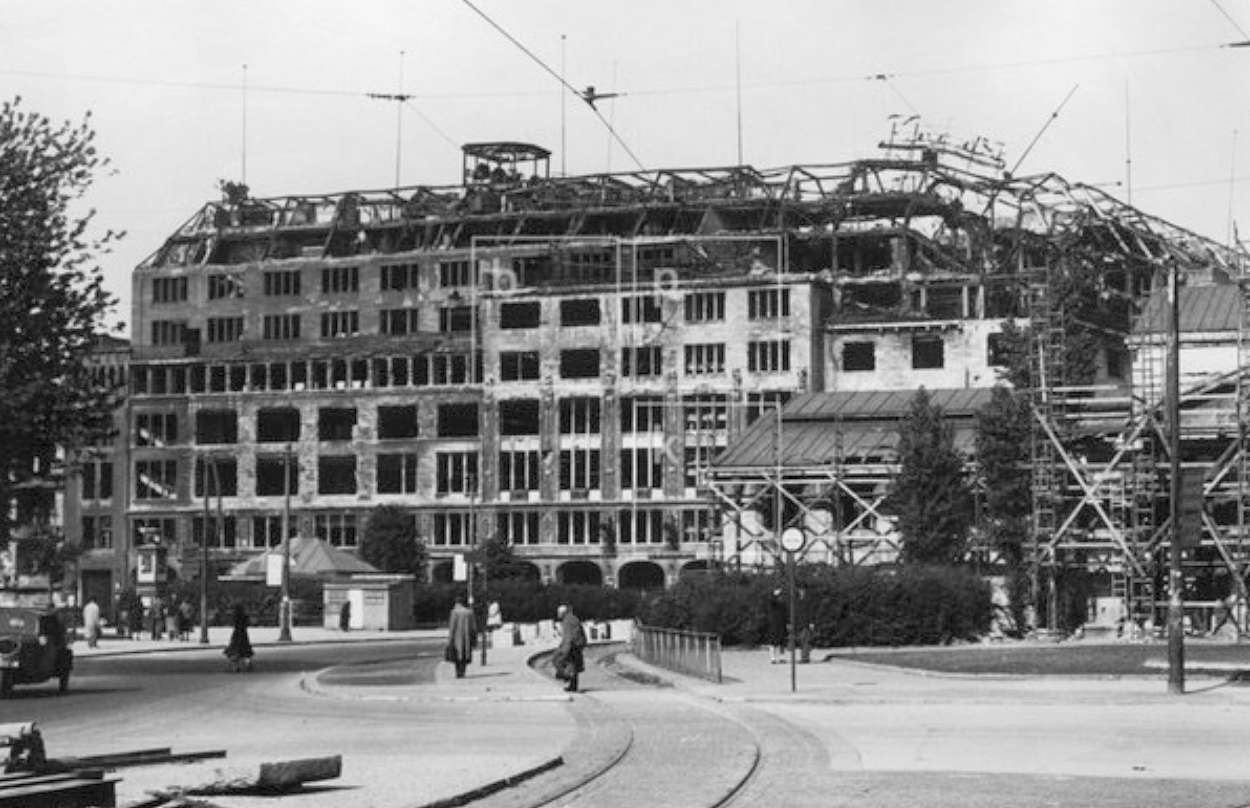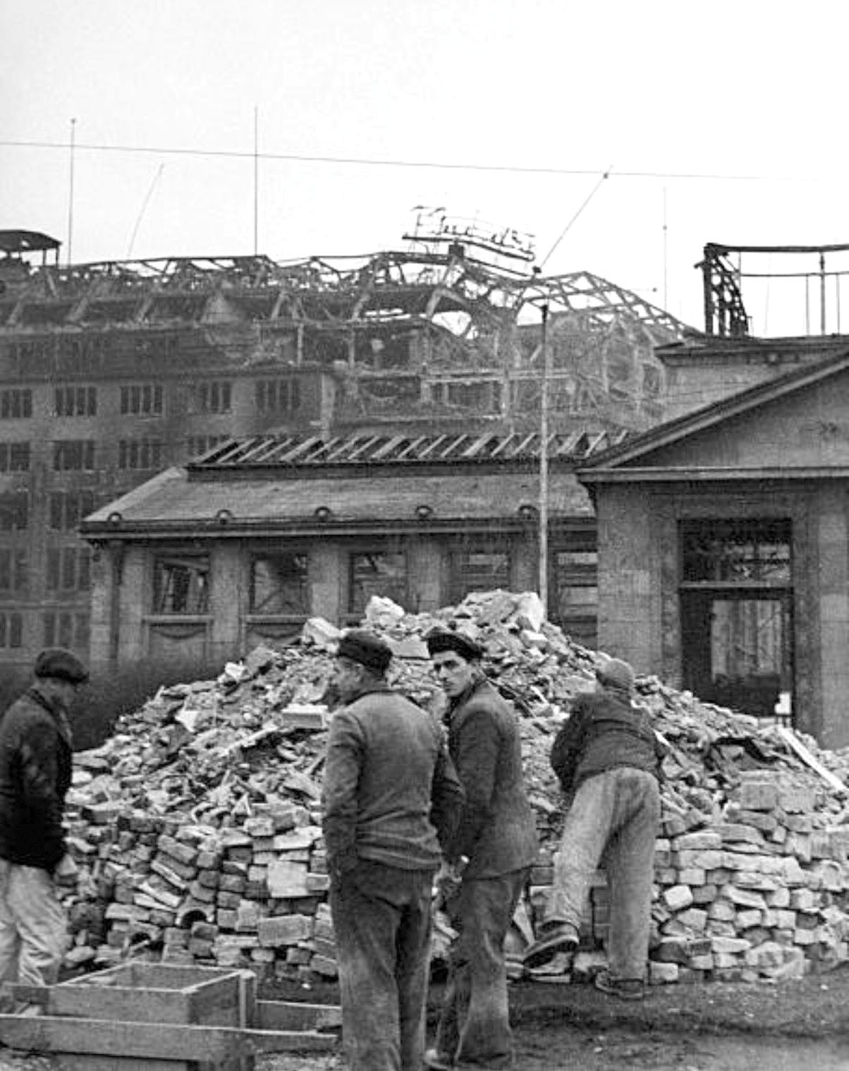 Cleaning work at Wittenbergplatz, 1945. In the background are the ruins of the former KaDeWe, with a burned out roof and twisted structure where the RAF bomber crashed onto the department’s roof a year before. Photo: Arthur Grimm/ullstein bild