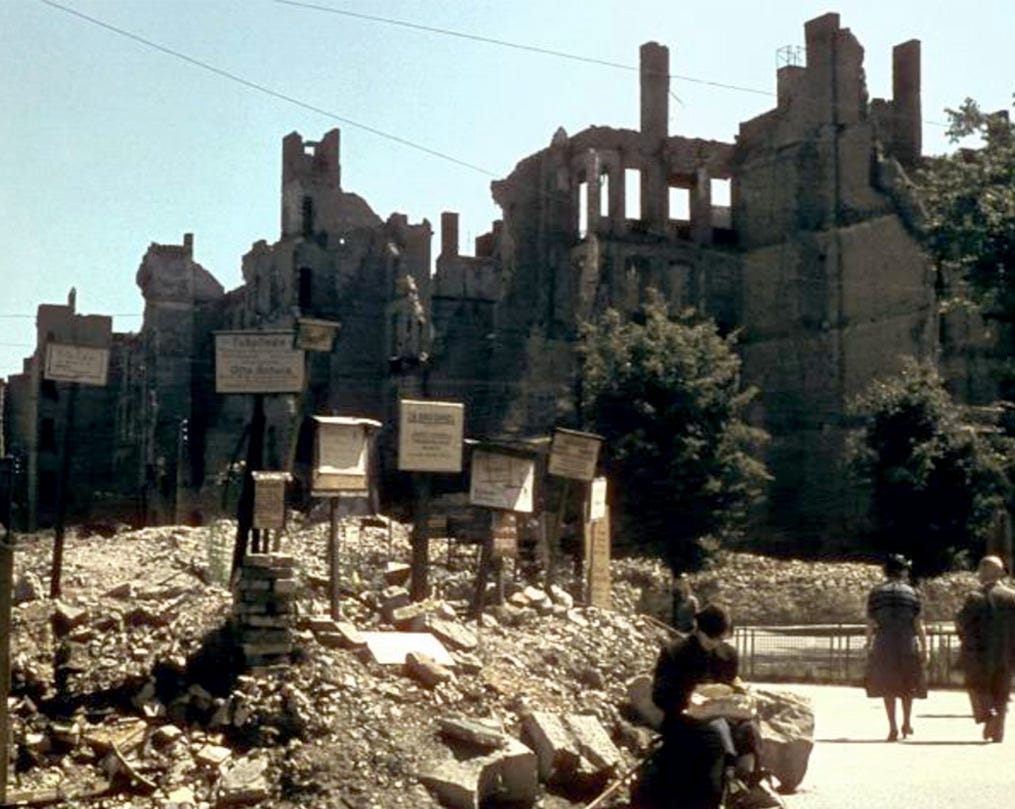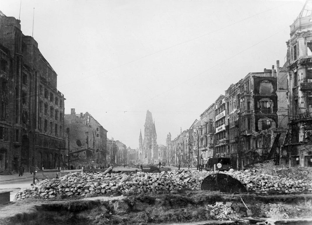 Year Zero: the sea of rubble and ruins that Tauentzienstr. has become by war’s end, seen from Wittenbergplatz with the heavily damaged Kaiser Wilhelm Memorial Church in the far background.