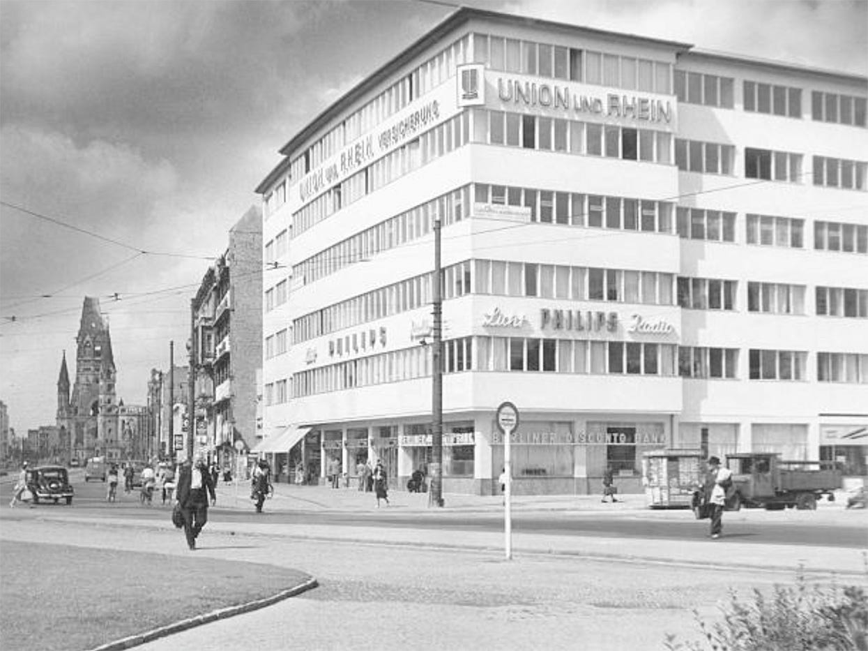 In the 1950s the new and vanguardist Philippshaus am Wittenbergplatz building was built at the former Nr 11, heavily damaged by war’s destruction. Note the Kaiser-Wilhelm-Gedächtniskirche in the far background.Photo: ullstein bild