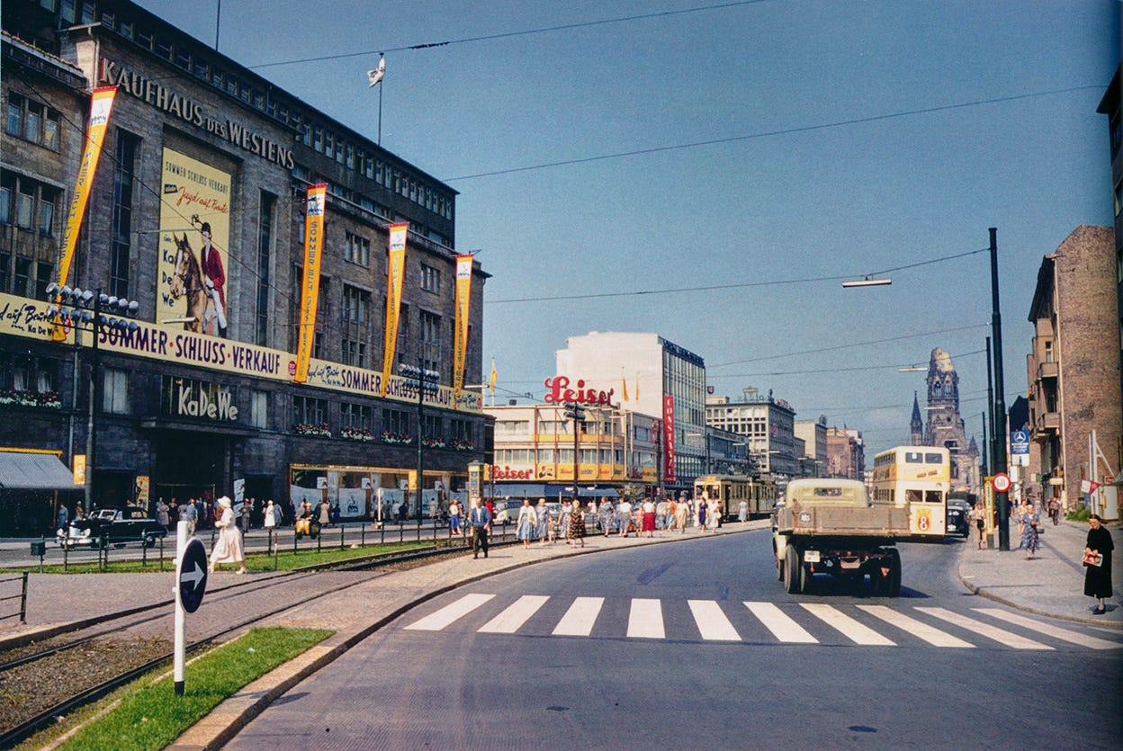 The rebirth of Tauentzienstraße as a commercial area part of West Berlin brought back life and colour as we can see here in the 1950s in this colour slide, with the KaDeWe and Leiser store departments at left.Photo: Sobotta, West Berlin Farbdias aus den 50ern bis 70ern, Sutton Verlag, 2019