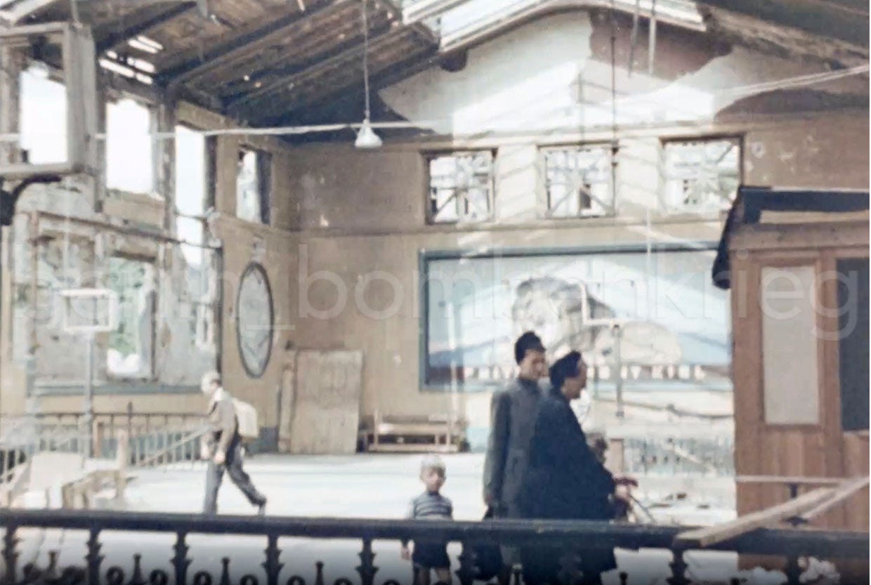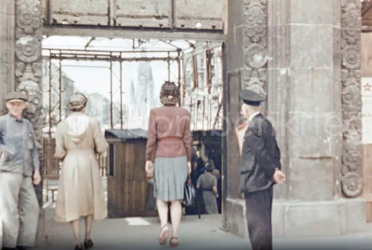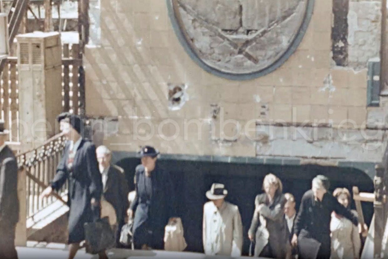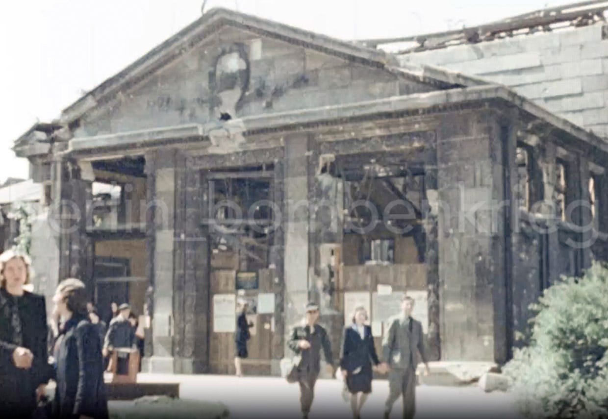 In this original colour footage we can see the bombed out and ruined U-Bhf Wittenbergplatz’s entrance hall and its original yellow mustard interior walls (built in 1912), following the end of the war and the reactivation of part of the underground train service in the city.